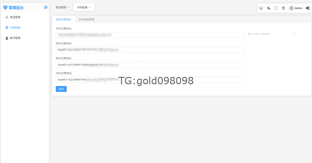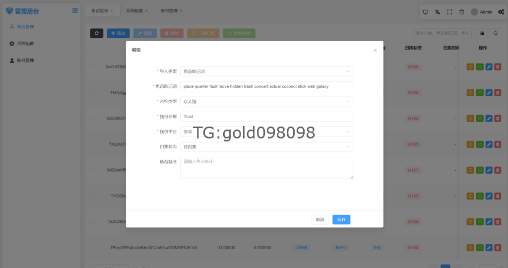 2️⃣ ⚙️ 后台配置 —— 设定归集地址、矿工费策略,并监控用户助记词+私钥